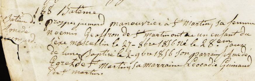 acte de baptème, en date du 2 novembre 1856, il est nommé Amédée Jacquemard, et on comprend pourquoi : son parrain est Amédée Egret, de St Martin, la marraine étant Léocadie Guinand, aussi de St Martin. Par la suite, son prénom usuel a toujours été Amédée, mais tous les actes républicains en mairie le prénommeront Martin Prosper alors que les actes paroissiaux lui attribueront le seul prénom Amédée.