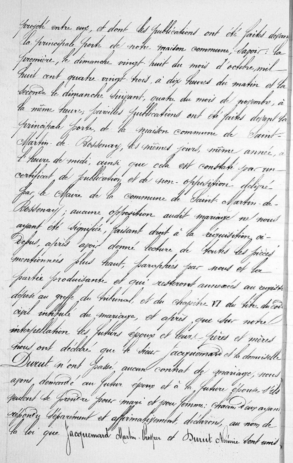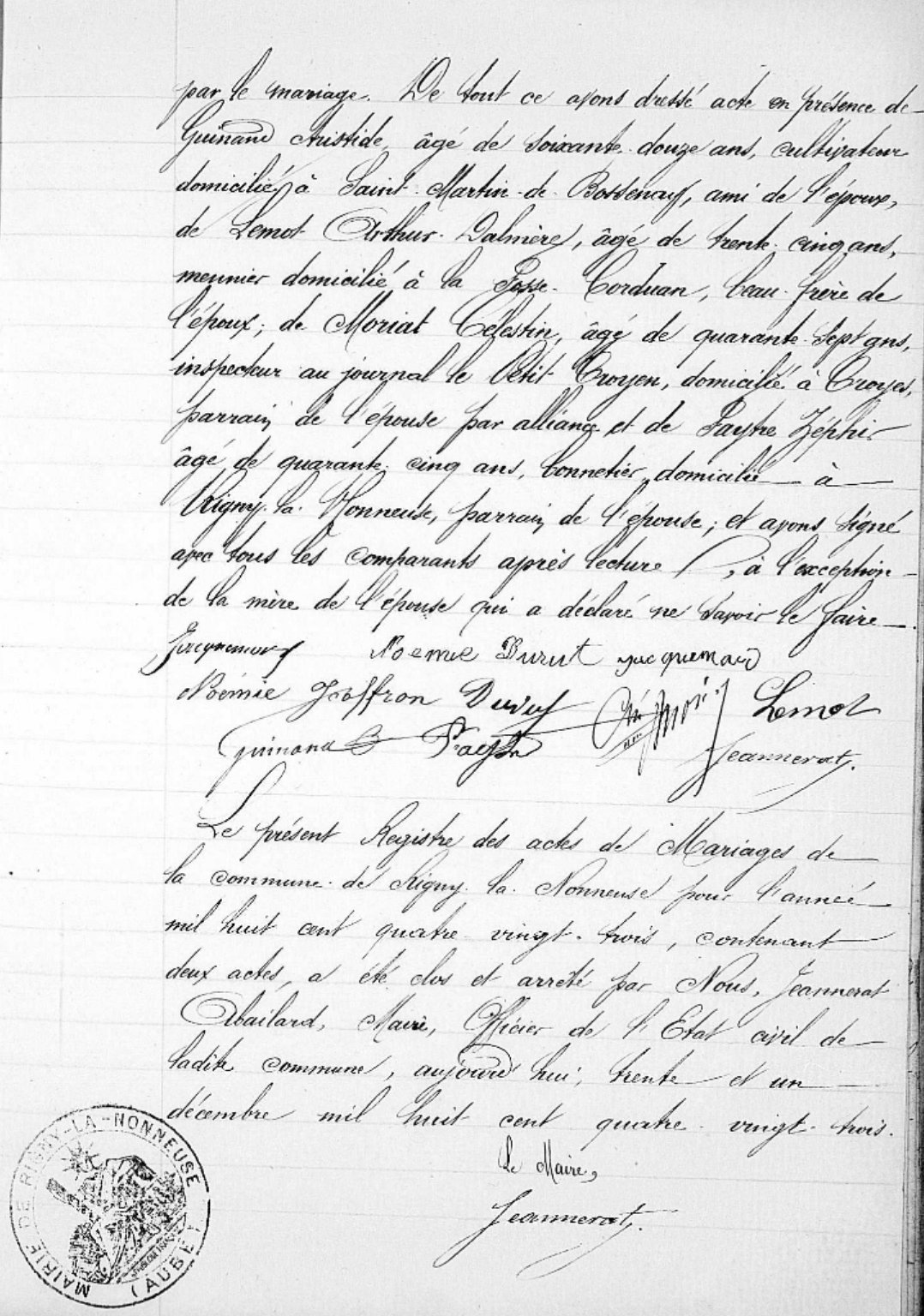acte de naissance), fille de Désiré Durut, garde-champêtre et Justine Dantigny. Le marié a 27 ans, la mariée 31 ans. L'acte est sur trois pages :