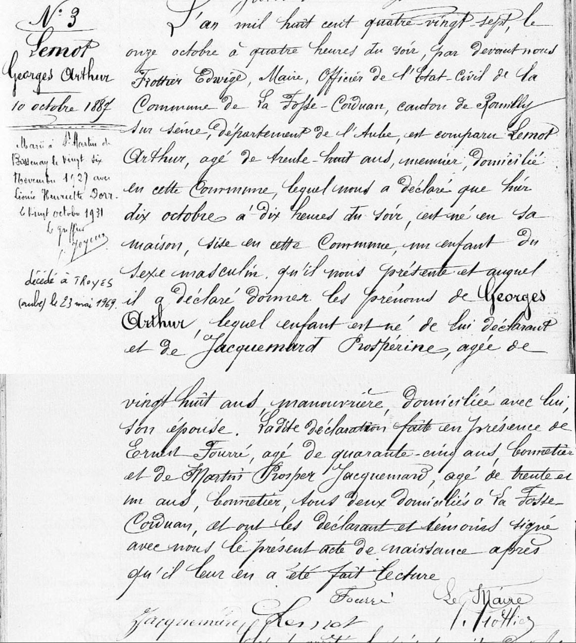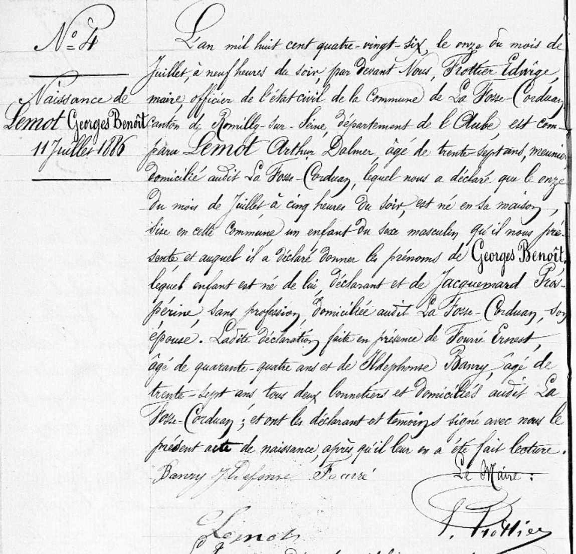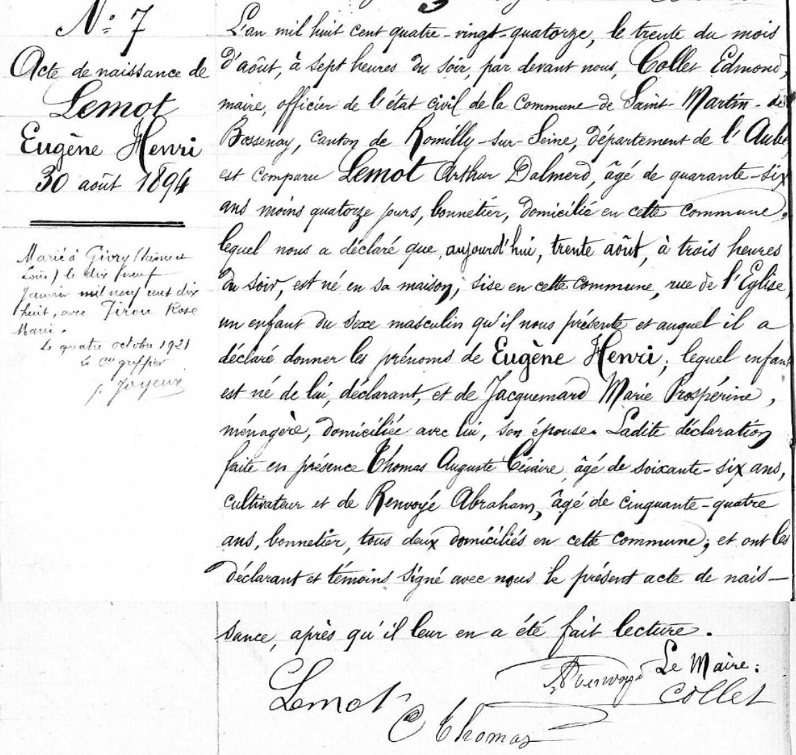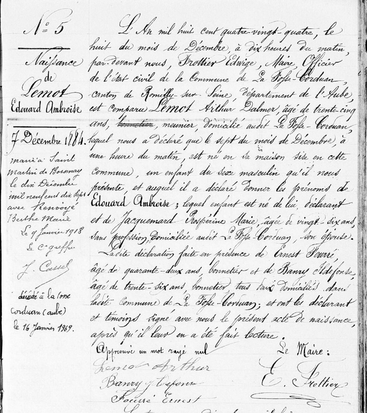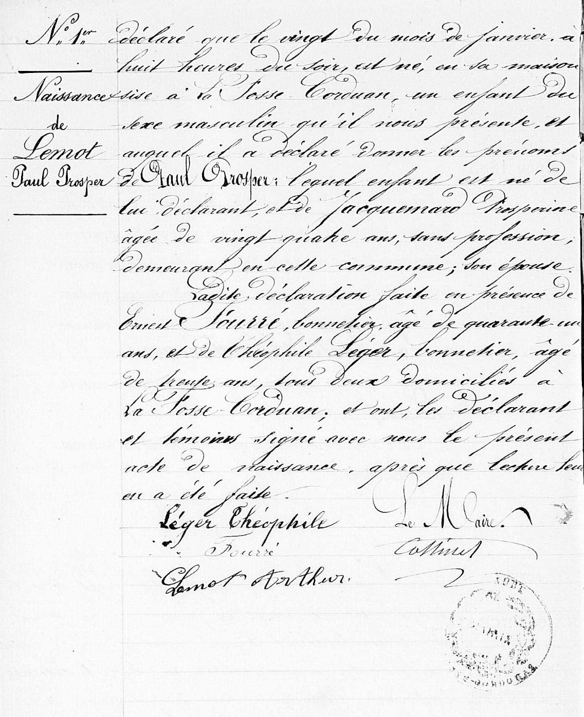 acte de naissance avec pour témoin son oncle Arthur Lemot, meunier). Son