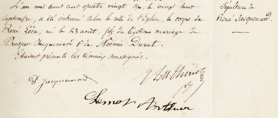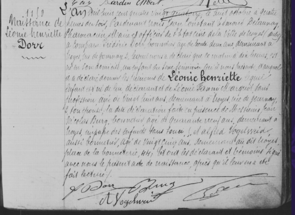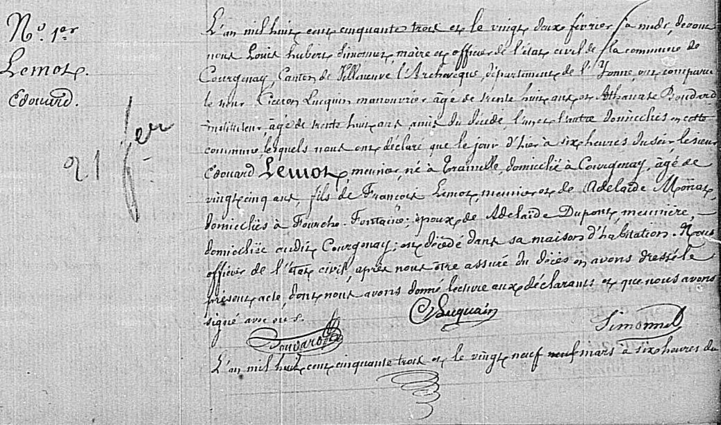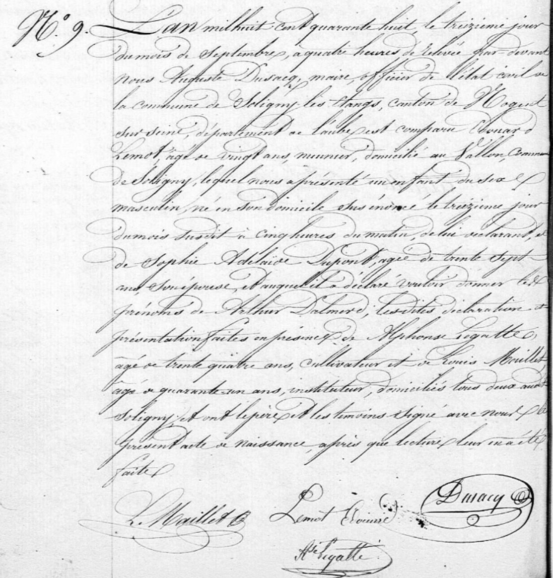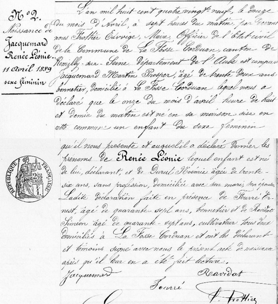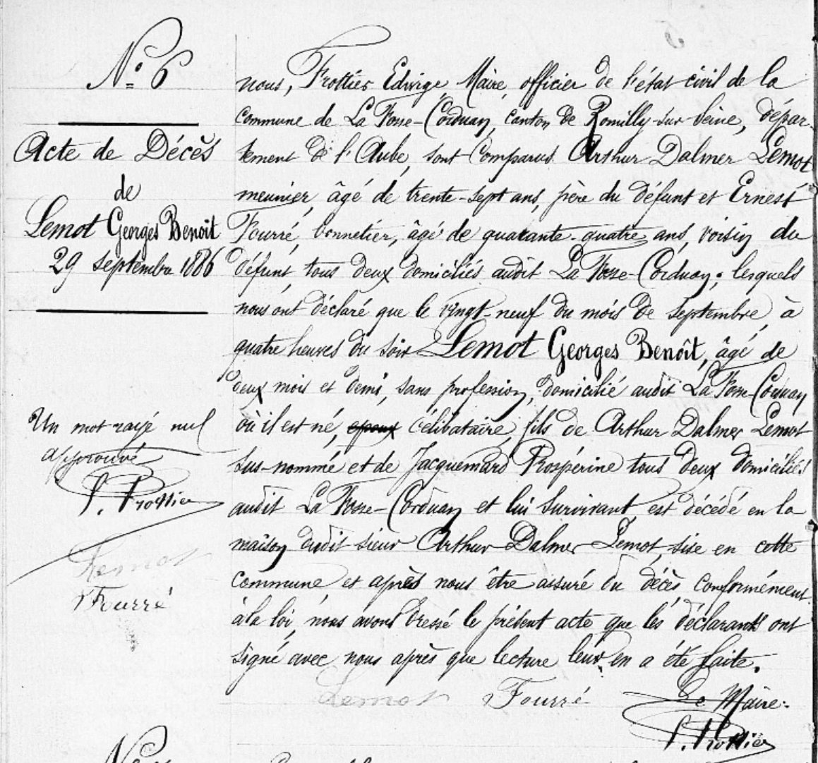 acte de naissance avec pour témoin son oncle Arthur Lemot, meunier). Son