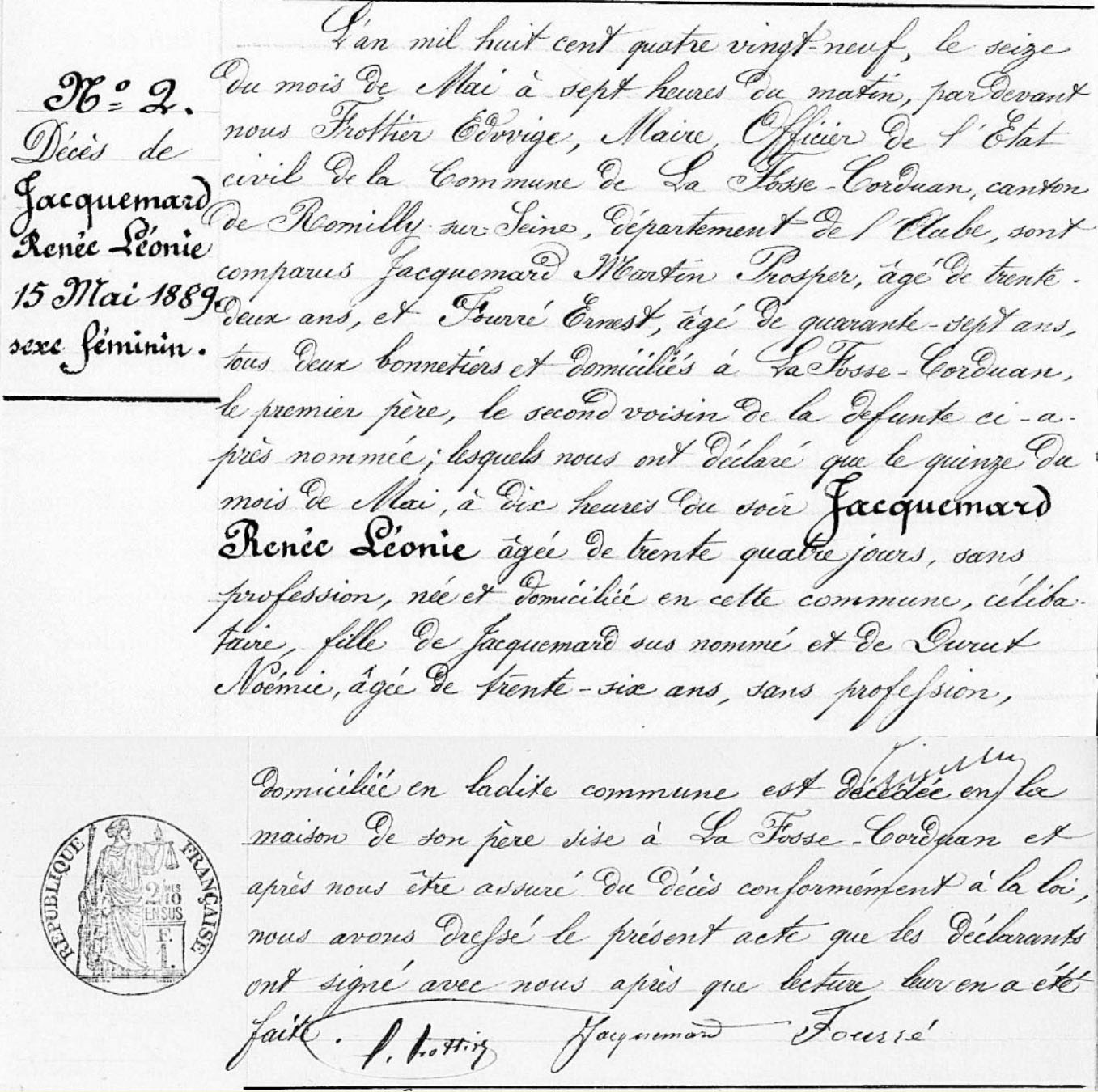 acte) (le parrain est son cousin Clémentin Ployé, oncle de Léopold , la marraine est sa tante Prospérine Jacquemard), décédé le 27 septembre 1886 (