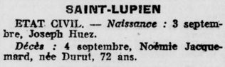 avis dans "Le Petit Troyen" du 10 septembre 1924), à l'âge de 72 ans, sans que l'on sache quelles sont les circonstances qui l'ont amenée en cette commune d'où est originaire sa mère.