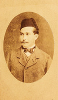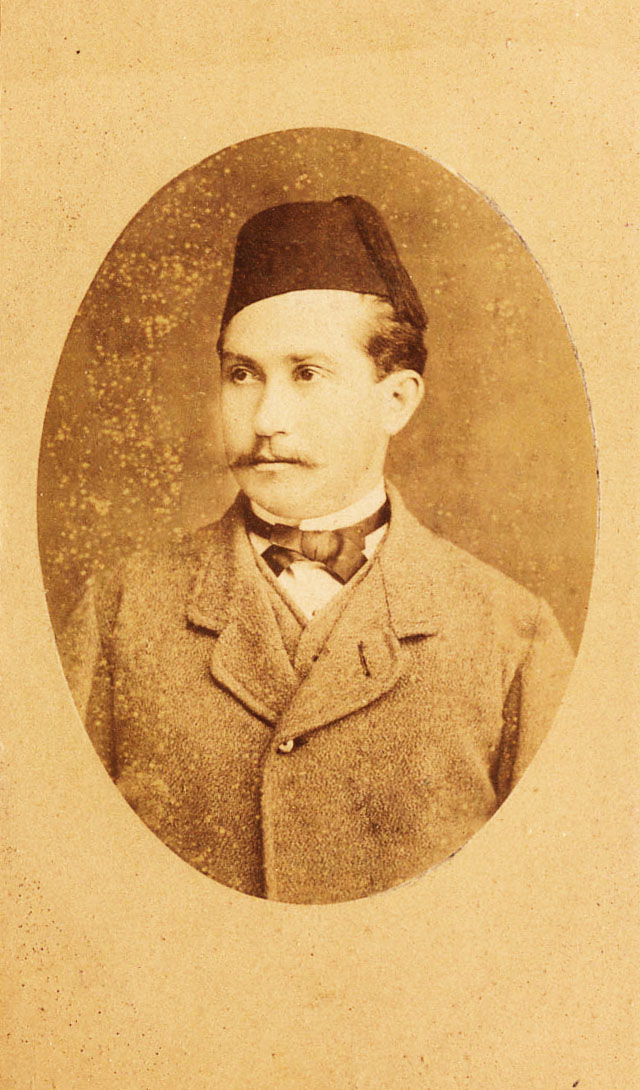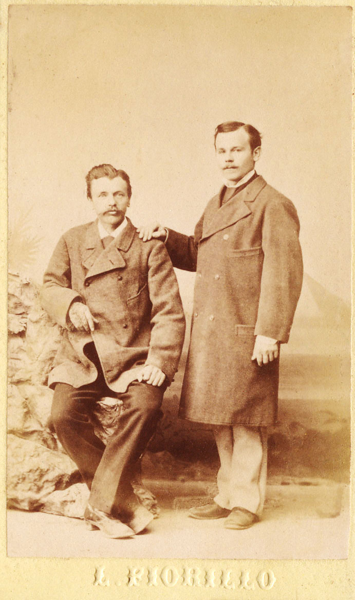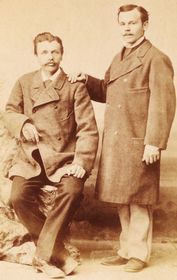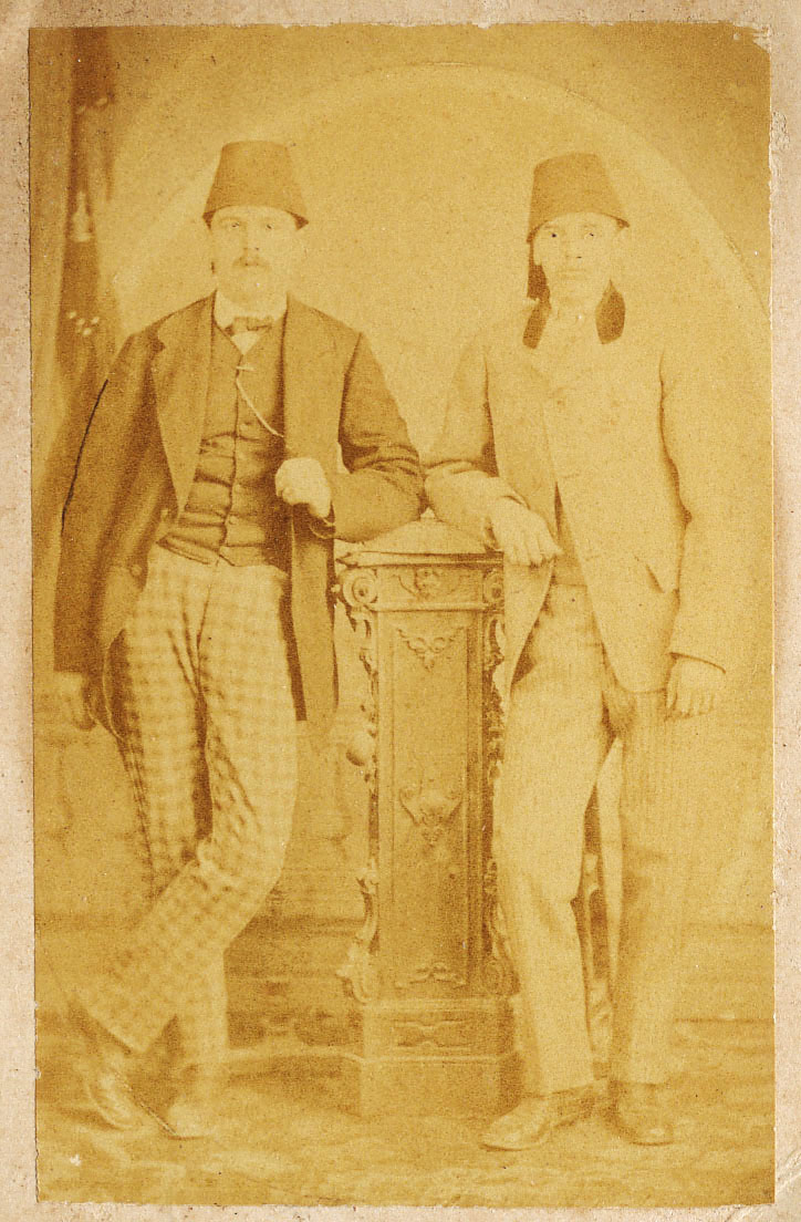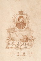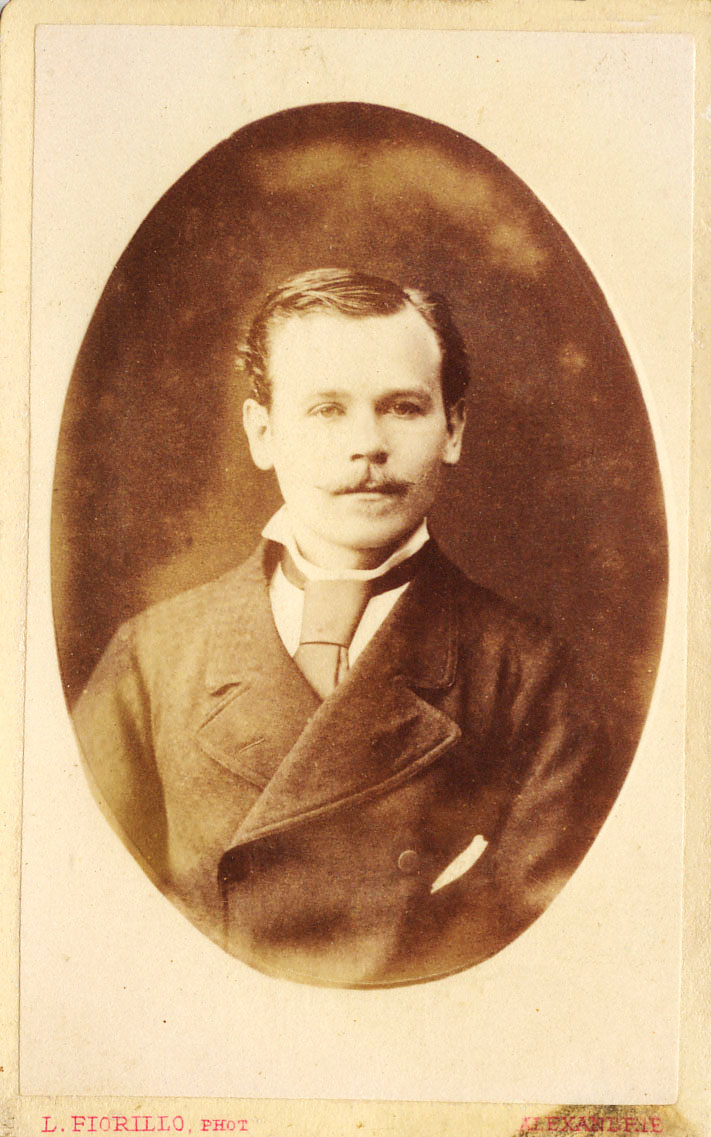 Deux photos d'Arthur Lemot ? Et une d'un autre Arthur... Il semble que ce soit le même homme qui soit présent sur ces photos, toutes deux prises chez Fiorillo photographe à Alexandrie de 1872 à 1890. Est-ce Arthur ? C'est une hypothèse plausible, car c'est la seule personne deux fois représentées dans les photos trouvées. Mais il manque des indices plus probants pour avoir une certitude raisonnable. En particulier, à moins d'avoir fait un court voyage préli-minaire avant même son mariage, Arthur serait parti au plus tôt en 1887, à 39 ans, c'est apparem-ment plus âgé que sur la photo... Et Arthur était apparemment petit, comme sur la personne debout sur la seconde photo. Il manque toutefois des indices plus probants pour avoir une certitude raisonnable. En particulier, Arthur est parti au plus tôt en 1887, à 39 ans, c'est apparemment plus âgé que sur la photo... Et il apparaît vraiment petit sur la seconde photo, alors que son compagnon assis semble trop grand... Une recherche sur la Toile a permis de trouver une photo datée de 1874 ayant le même pied que celle ci-dessus à gauche :