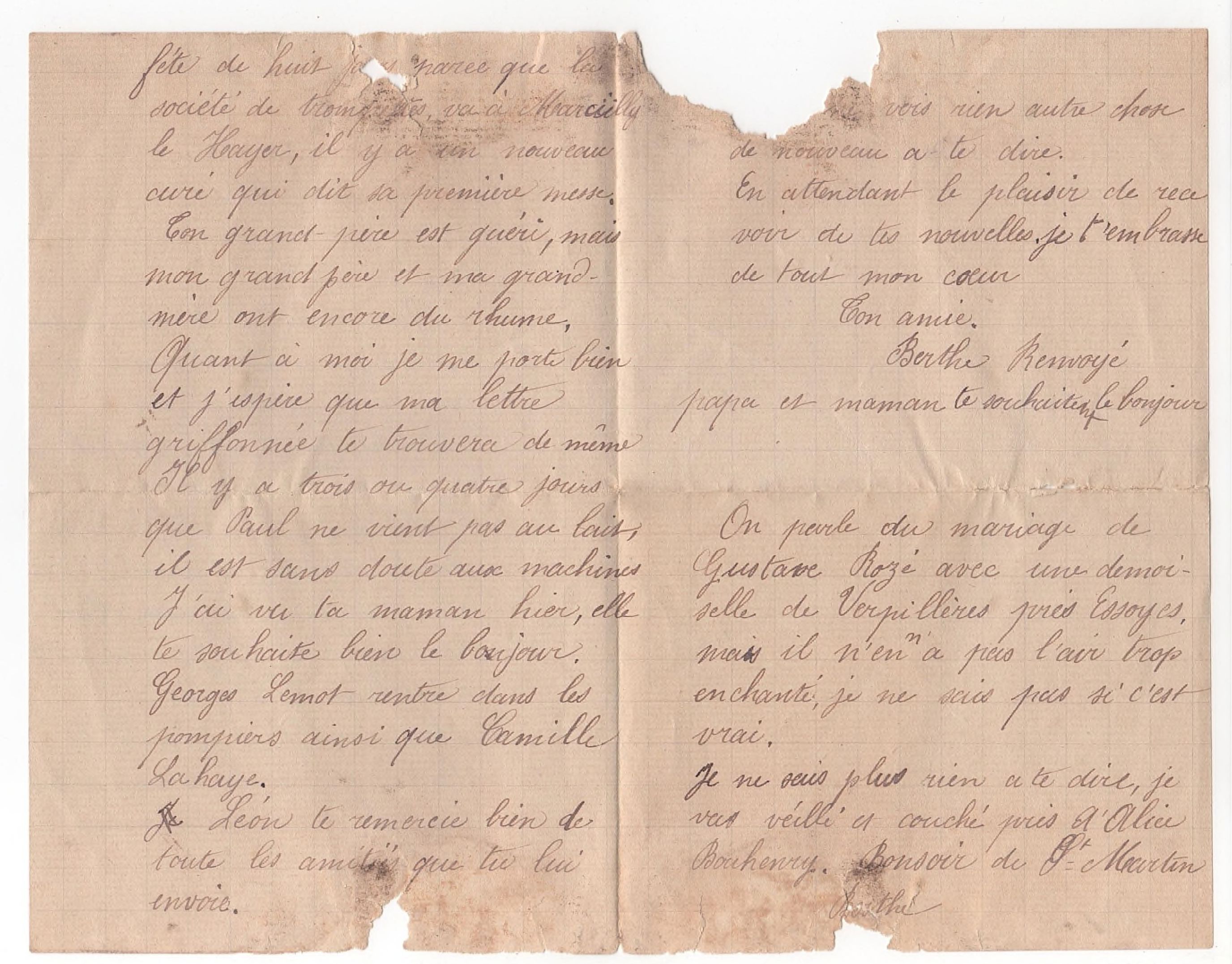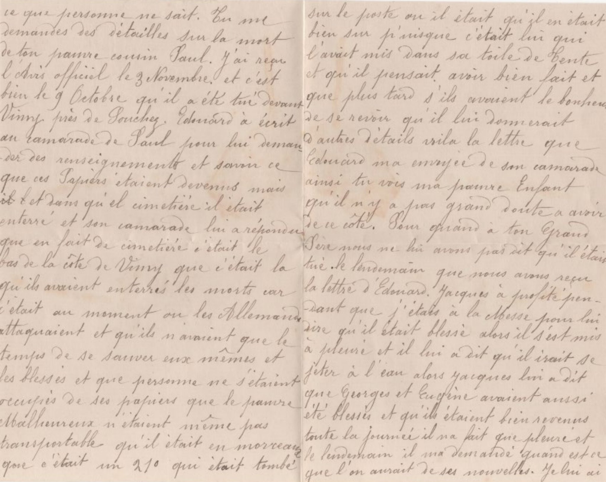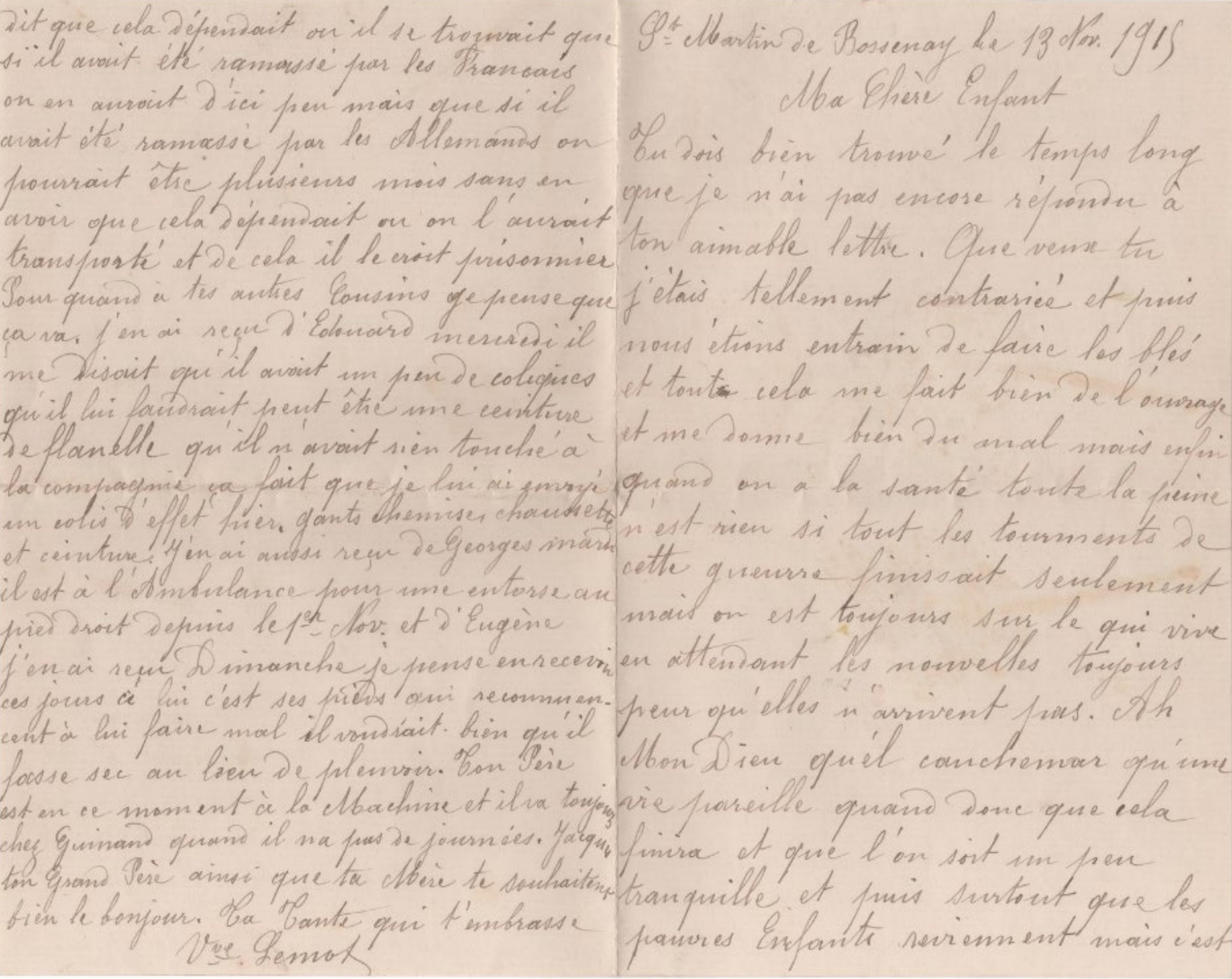 Ma chère enfant Tu dois bien trouver le temps long, que je n'ai pas encore répondu à ton aimable lettre. Que veux-tu, j'étais tellement contrariée, et puis nous étions en train de faire les blés et tout cela me fait bien de l'ouvrage et me donne bien du mal. Mais enfin, quand on a la santé toute la peine n'est rien ; si tous les tourments de cette guerre finissaient seulement, mais on est toujours sur le qui-vive en attendant les nouvelles, toujours peur qu'elles n'arrivent pas. Ah Mon Dieu, quel cauchemar qu'une vie pareille. Quand donc que cela finira et que l'on soit un peu tranquille. Et puis surtout que les pauvres Enfants reviennent, mais c'est ce que personne ne sait. Tu me demandes des détails sur la mort de ton pauvre cousin Paul. J'ai reçu l'avis officiel le 3 novembre et c'est bien le 9 octobre qu'il a été tué devant Vimy, près de Souchez. Edouard a écrit au camarade de Paul pour lui demander des renseignements et savoir ce que ses papiers étaient devenus et dans quel cimetière il était enterré. Son camarade lui a répondu que, en fait de cimetière, c'était le bas de la côte de Vimy. C'était là qu'ils avaient enterré les morts car les allemands attaquaient et ils n'avaient que le temps de se sauver, eux-mêmes et les blessés. Personne ne s'était occupé de ses papiers, le pauvre Malheureux n'était même pas transportable, il était en morceaux. C'était un 210 qui était tombé sur le poste où il était, il en était bien sûr puisque c'est lui qui l'avait mis dans sa toile de tente et qu'il pensait avoir bien fait. Et, plus tard, s'ils avaient le bonheur de se revoir, qu'il lui donnerait d'autres détails. Voilà la lettre qu'Edouard m'a envoyée de son camarade. Ainsi tu vois, ma pauvre enfant qu'il n'y a pas grand doute à avoir de ce côté. Quant à ton grand-père, nous ne lui avons pas dit qu'il était tué le lendemain que nous avons reçu la lettre d'Edouard. Jacques a profité que j'étais à la messe pour lui dire qu'il était blessé. Alors, il s'est mis à pleurer et il lui a dit qu'il irait se jeter à l'eau. Alors Jacques lui a dit que Georges et Eugène avaient aussi été blessés et qu'ils étaient bien revenus. Toute la journée, il n'a fait que pleurer et le lendemain, il m'a demandé quand est-ce que l'on aurait de ses nouvelles. Je lui ai dit que cela dépendait où il se trouvait, que s'il avait été ramassé par les Français, on en aurait d'ici peu, mais que si il avait ramassé par les Allemands, on pourrait Être plusieurs mois sans en avoir, que cela dépendait où on l'aurait transporté. Et de cela, il le croit prisonnier. Quant aux nouvelles de tes autres cousins, je pense que ça va. J'en ai reçu d'Edouard mercredi, il me disait qu'il avait un peu de coliques, qu'il lui faudrait peut-être une ceinture de flanelle, qu'il n'avait rien touché à la compagnie. Ca fait que je lui ai envoyé son colis d'effets hier, gants, chemises, chaussettes et ceintures. J'en ai aussi reçues de Georges mardi, il est à l'ambulance pour une entorse au pied droit depuis le 1er novembre. Et d'Eugène, j'en ai reçues dimanche. Je pense en recevoir ces jours ci, lui c'est ses pieds qui recommencent à lui faire mal, il voudrait bien qu'il fasse sec au lieu de pleuvoir. Ton père est en ce moment à la Machine et il va toujours chez Guinand quand il n'a pas de journée. Jacques, ton grand-père ainsi que ta mère te souhaitent bien le bonjour. Ta tante qui t'embrasse. Vve Lemot. |
