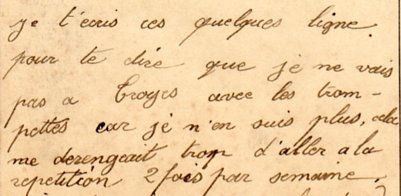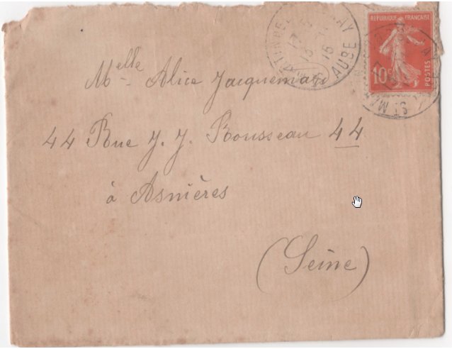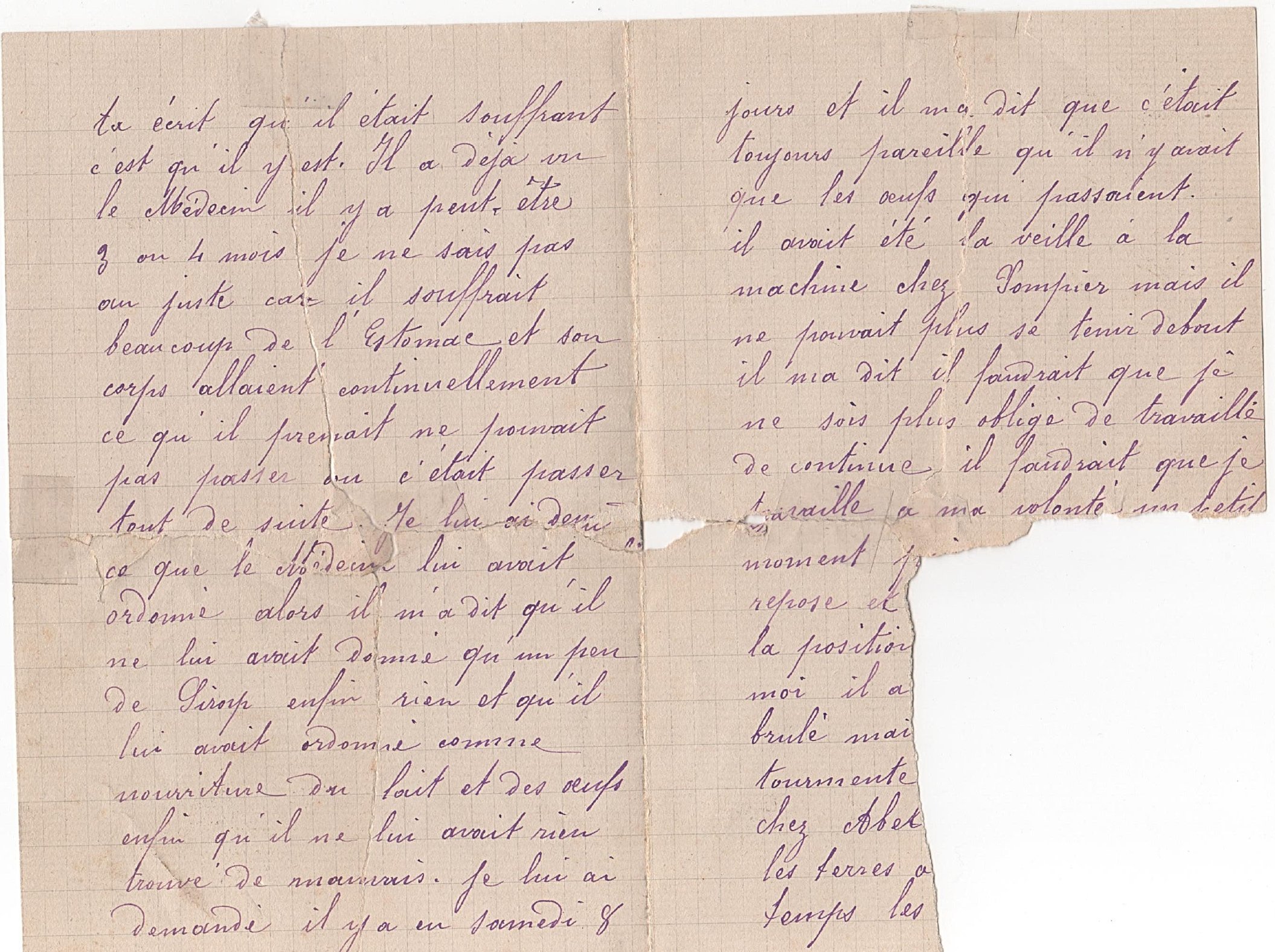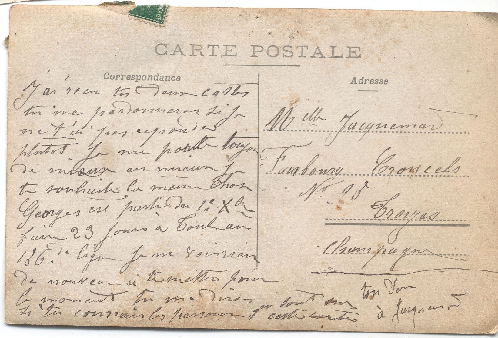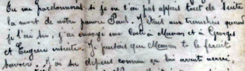 Ma chère enfant Tu dois bien trouver le temps long, que je n'ai pas encore répondu à ton aimable lettre. Que veux-tu, j'étais tellement contrariée, et puis nous étions en train de faire les blés et tout cela me fait bien de l'ouvrage et me donne bien du mal. Mais enfin, quand on a la santé toute la peine n'est rien ; si tous les tourments de cette guerre finissaient seulement, mais on est toujours sur le qui-vive en attendant les nouvelles, toujours peur qu'elles n'arrivent pas. Ah Mon Dieu, quel cauchemar qu'une vie pareille. Quand donc que cela finira et que l'on soit un peu tranquille. Et puis surtout que les pauvres Enfants reviennent, mais c'est ce que personne ne sait. Tu me demandes des détails sur la mort de ton pauvre cousin Paul. J'ai reçu l'avis officiel le 3 novembre et c'est bien le 9 octobre qu'il a été tué devant Vimy, près de Souchez. Edouard a écrit au camarade de Paul pour lui demander des renseignements et savoir ce que ses papiers étaient devenus et dans quel cimetière il était enterré. Son camarade lui a répondu que, en fait de cimetière, c'était le bas de la côte de Vimy. C'était là qu'ils avaient enterré les morts car les allemands attaquaient et ils n'avaient que le temps de se sauver, eux-mêmes et les blessés. Personne ne s'était occupé de ses papiers, le pauvre Malheureux n'était même pas transportable, il était en morceaux. C'était un 210 qui était tombé sur le poste où il était, il en était bien sûr puisque c'est lui qui l'avait mis dans sa toile de tente et qu'il pensait avoir bien fait. Et, plus tard, s'ils avaient le bonheur de se revoir, qu'il lui donnerait d'autres détails. Voilà la lettre qu'Edouard m'a envoyée de son camarade. Ainsi tu vois, ma pauvre enfant qu'il n'y a pas grand doute à avoir de ce côté. Quant à ton grand-père, nous ne lui avons pas dit qu'il était tué le lendemain que nous avons reçu la lettre d'Edouard. Jacques a profité que j'étais à la messe pour lui dire qu'il était blessé. Alors, il s'est mis à pleurer et il lui a dit qu'il irait se jeter à l'eau. Alors Jacques lui a dit que Georges et Eugène avaient aussi été blessés et qu'ils étaient bien revenus. Toute la journée, il n'a fait que pleurer et le lendemain, il m'a demandé quand est-ce que l'on aurait de ses nouvelles. Je lui ai dit que cela dépendait où il se trouvait, que s'il avait été ramassé par les Français, on en aurait d'ici peu, mais que si il avait ramassé par les Allemands, on pourrait Être plusieurs mois sans en avoir, que cela dépendait où on l'aurait transporté. Et de cela, il le croit prisonnier. Quant aux nouvelles de tes autres cousins, je pense que ça va. J'en ai reçu d'Edouard mercredi, il me disait qu'il avait un peu de coliques, qu'il lui faudrait peut-être une ceinture de flanelle, qu'il n'avait rien touché à la compagnie. Ca fait que je lui ai envoyé son colis d'effets hier, gants, chemises, chaussettes et ceintures. J'en ai aussi reçues de Georges mardi, il est à l'ambulance pour une entorse au pied droit depuis le 1er novembre. Et d'Eugène, j'en ai reçues dimanche. Je pense en recevoir ces jours ci, lui c'est ses pieds qui recommencent à lui faire mal, il voudrait bien qu'il fasse sec au lieu de pleuvoir. Ton père est en ce moment à la Machine et il va toujours chez Guinand quand il n'a pas de journée. Jacques, ton grand-père ainsi que ta mère te souhaitent bien le bonjour. Ta tante qui t'embrasse. Vve Lemot. |