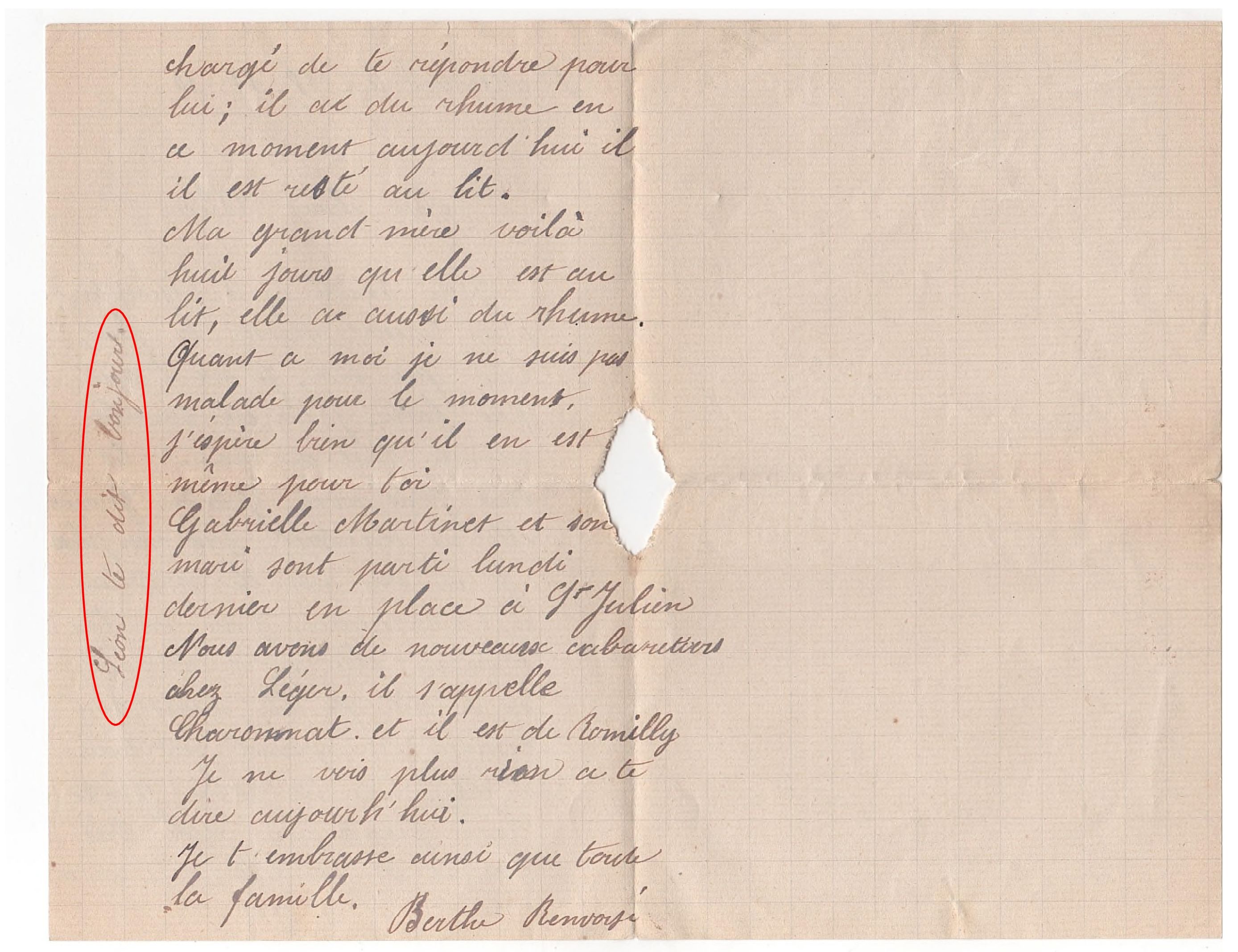 3 (pendant la guerre 1914-18) ; et deux lettres de trois et deux pages su 18 novembre 1910 et du 9 décembre 1910 par Berthe Renvoyé :