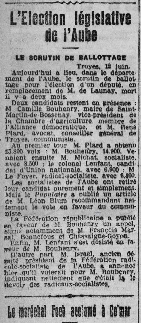 article de l'Express du Midi du 13 juin 1927 sur l'élection dont il sortira vainqueur.