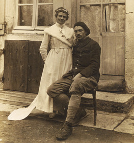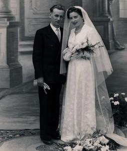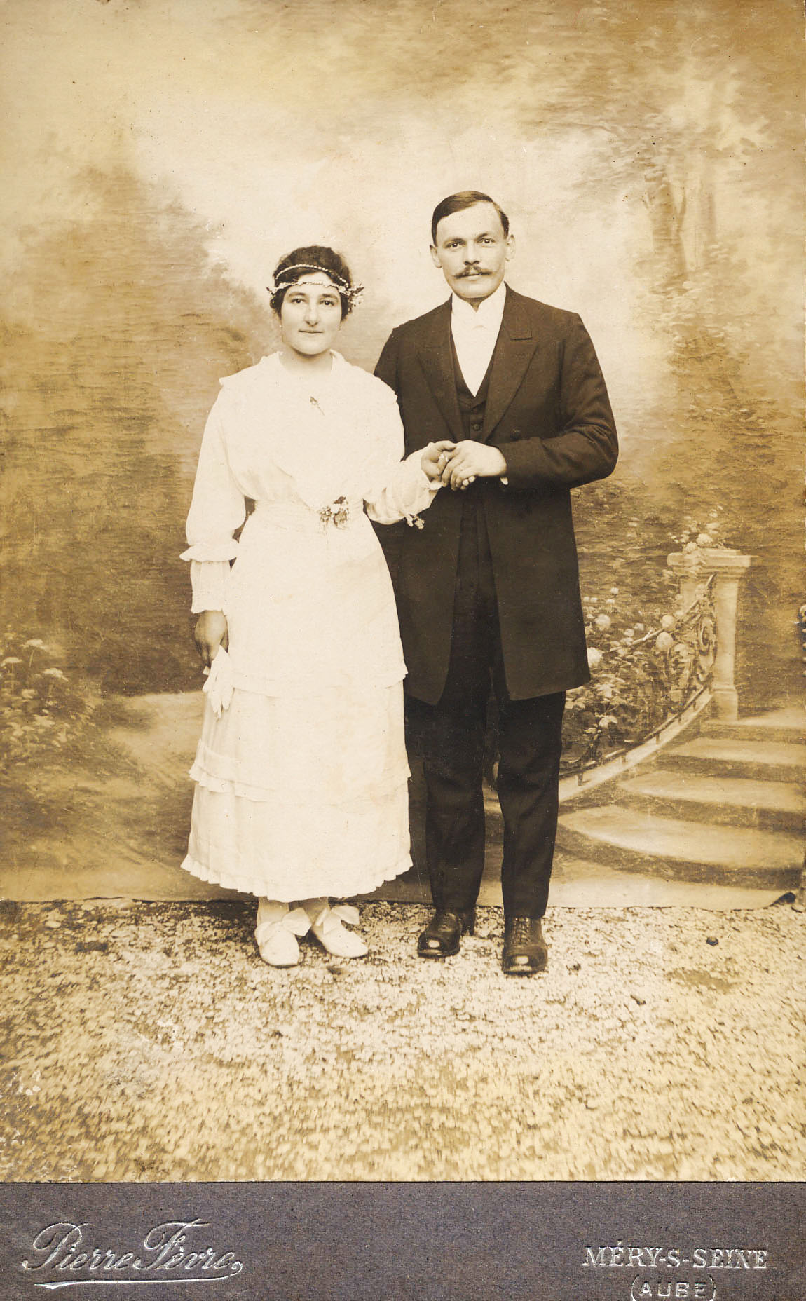 | Arthur et Prospérine se sont mariés en 1882, Jules et Lucette en 1920. Il y a des spécialistes de photos anciennes qui doivent avoir des critères de reconnaissance fondés sur cet important écart de 38 années. La question a donc été posée au forum "Photo ancienne et portraits" de geneanet. Voici la réponse : "Le photographe Pierre Fèvre est né en 1880, mort en 1914...donc soit c'est un 3ème mariage, soit un successeur à gardé le nom et c'est le mariage de 1920... http://www.portraitsepia.fr/photographes/fevre/". Et c'est vers 1920 que les robes de mariées commencent à raccourcir... C'est donc une photo du mariage de Lucette Gillopé et Jules Jadot. |