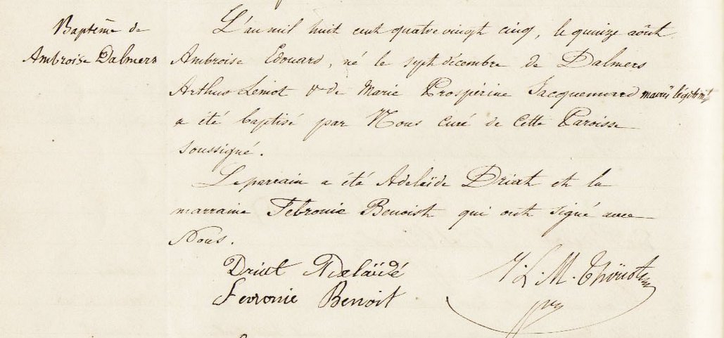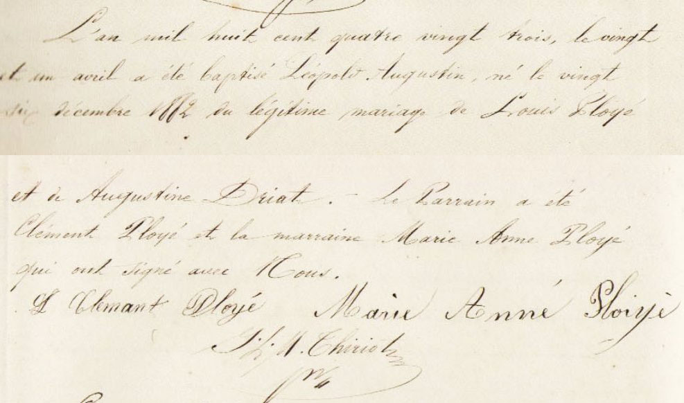 acte de baptème d'Edouard, le 15 août 1885 à St Martin, les parrain et marraine sont inversés. La marraine est Adélaïde Driat tante de Léopold Ployé.