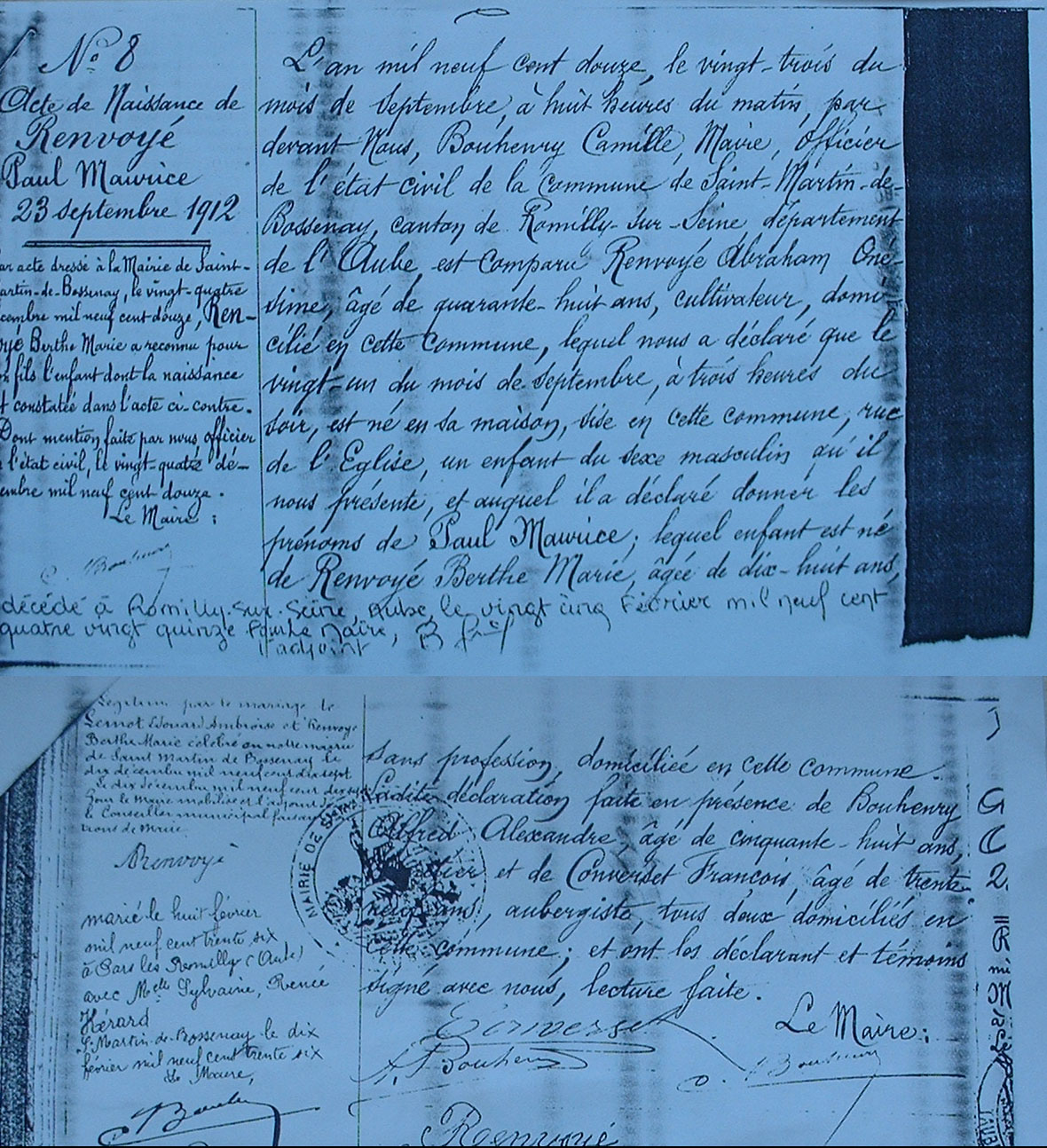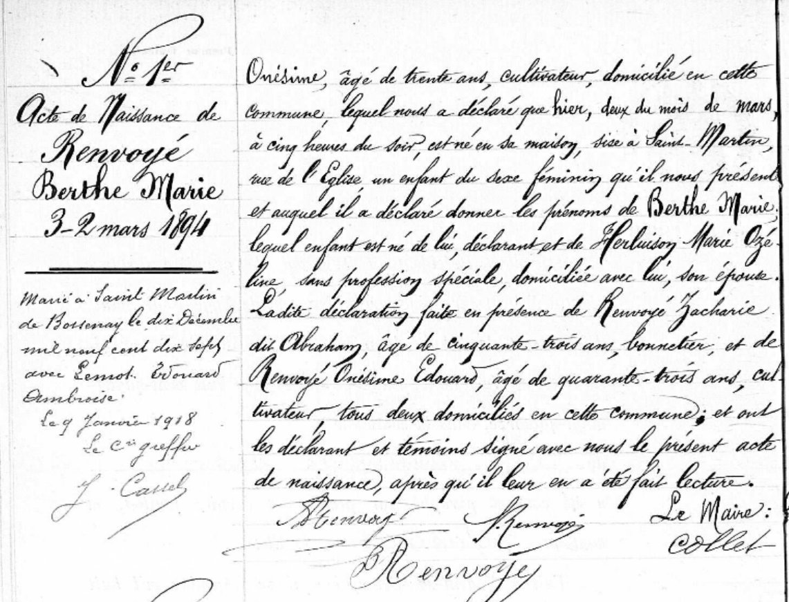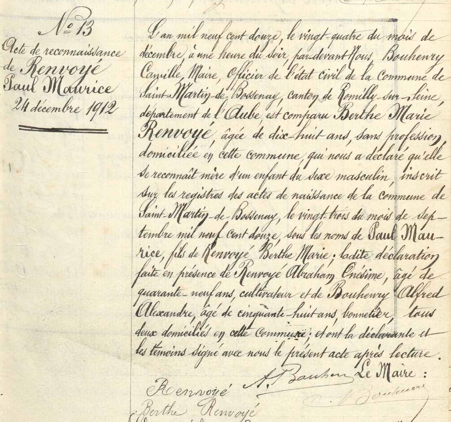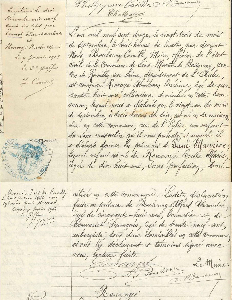 acte de reconnaissance" de l'enfant. Le 10 décembre 1917, à St Martin, Edouard Lemot épouse sa voisine Berthe Renvoyé et reconnaît l'enfant qui devient Paul Maurice Lemot (acte en trois pages :