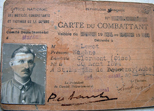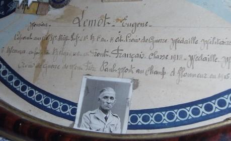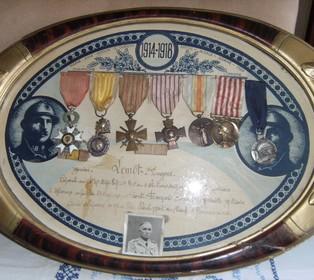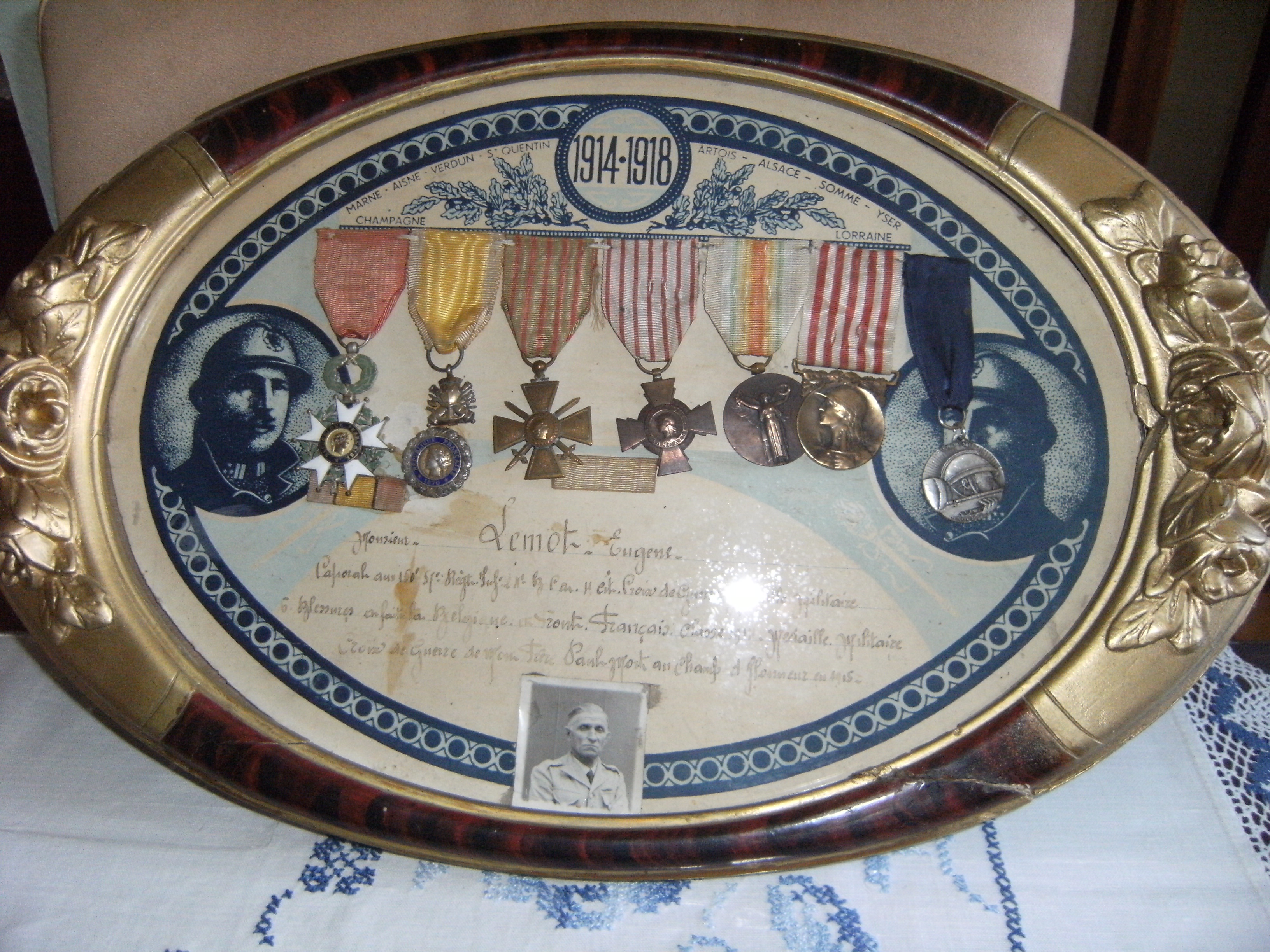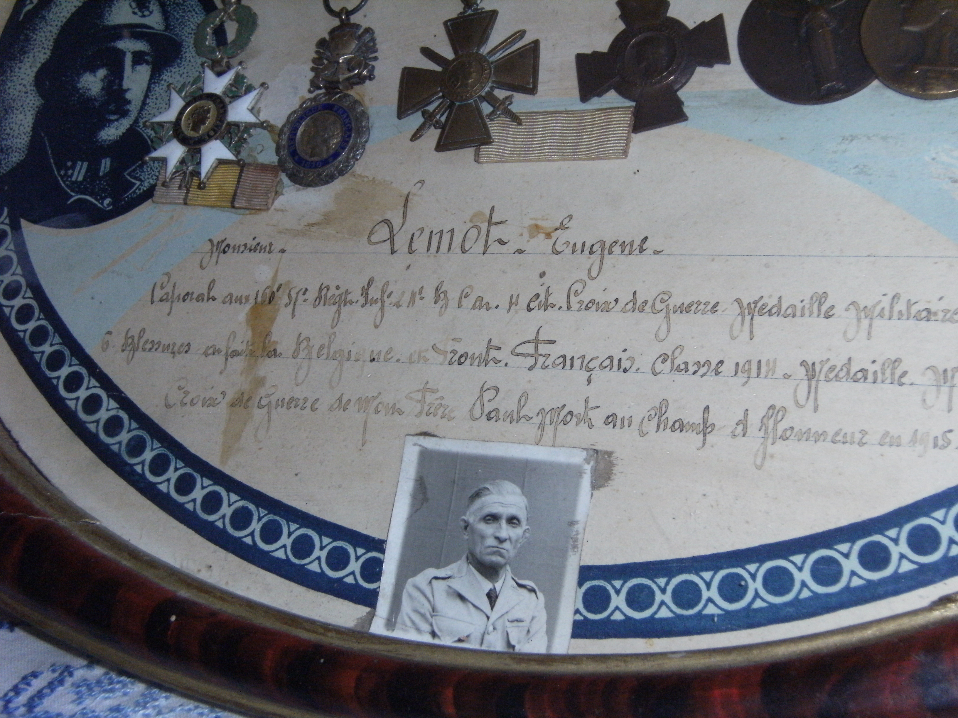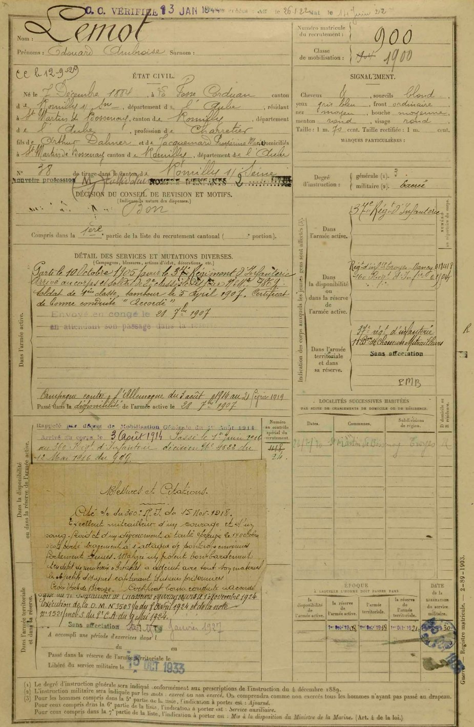 fiche matricule militaire, il est incorporé dans l'armée le 3 septembre 1914. A cinq reprise Edouard a été blessé. Il avait la moitié du visage paralysé, avec un oeil en moins. Il a vécu avec un éclat d'obus dans le corps. Extraits de sa fiche : "En plein combat et dans une situation difficile, il a contribué à arrêter net et à disperser une violente contre-attaque et à enrayer le mouvement que l'ennemi masquait derrière un rideau d'hommes levant les bras. Le 4 décembre 1916, après avoir traversé le canal de la Sambre fortement défendu par l'ennemi, s'est porté brillamment à l'attaque, a contribué à la désorganisation des résistances ennemies, à la capture de nombreux prisonniers, d'un important matériel, dont plusieurs pièces d'artillerie. Le 17 juillet 1917, sous un violent bombardement, a gardé tout son sang-froid et a très efficacement contribué par la précision de son tir à arrêter une tentative d'attaque ennemie".