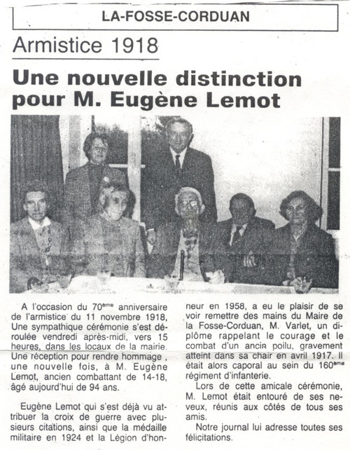 L'Est-Eclair du 11 novembre 1988, Eugène, 93 ans, est entouré de son neveu Paul junior à gauche, Gustave et sa nièce Rose à droite.