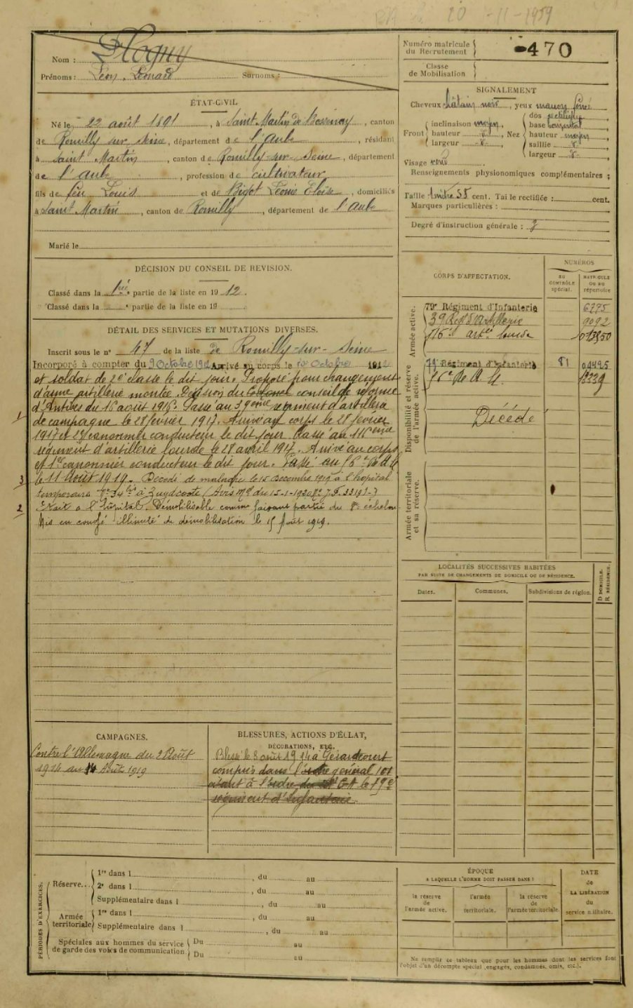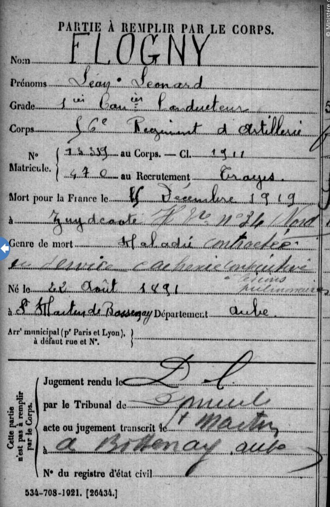 fiche matricule militaire, Léon Léonard Flogny est né le 22 août 1891 à St Martin et a donc trois ans de plus que Berthe. Ses parents sont Louis Flogny (décédé le 7 février 1905 à St Martin,