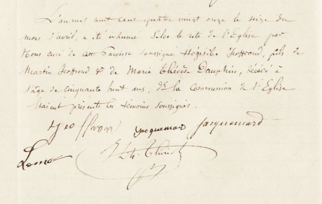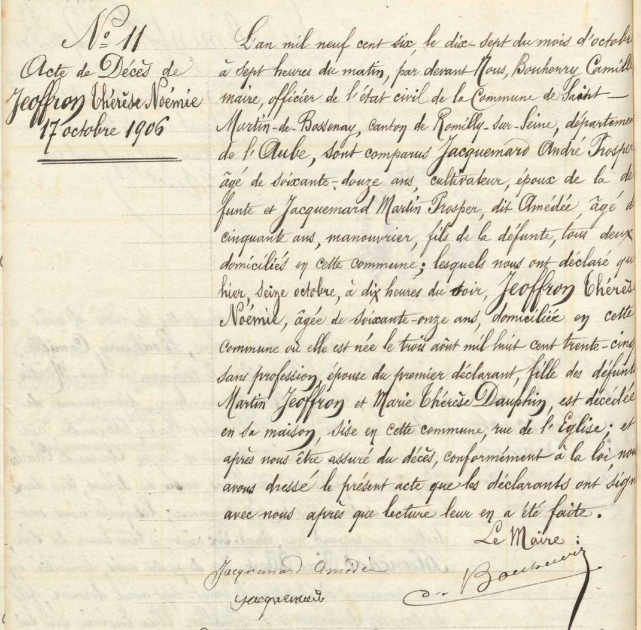 ici son acte d'inhumation, en présence de son neveu Eugène Joffron, frère de Noémie).