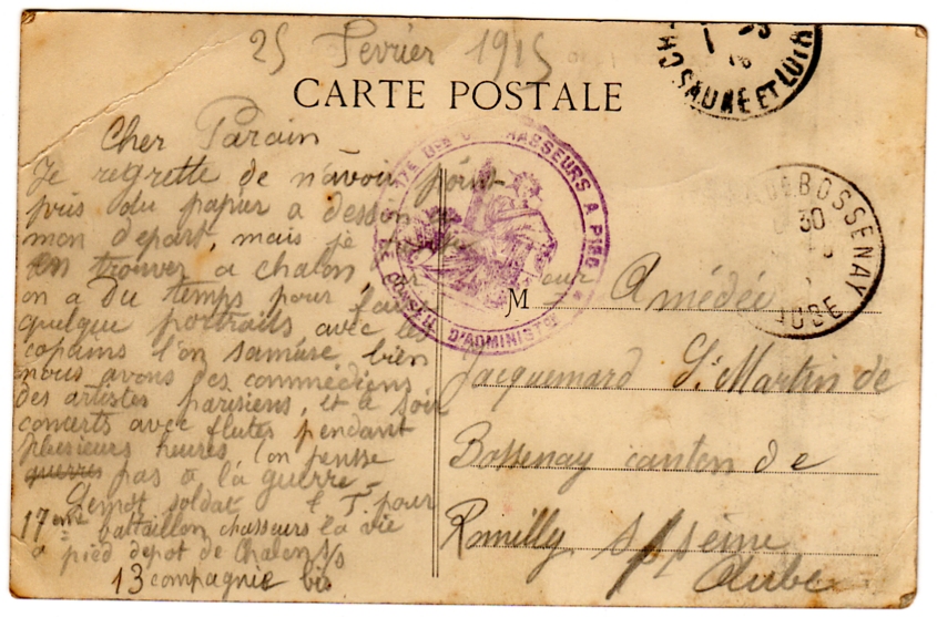 fiche de décès, il est noté "tué à l'ennemi", il était chasseur de 2ème classe au 17ème bataillon de chasseurs alpins (chasseurs à pied sur sa fiche matricule). Pour ce bataillon, il était de
