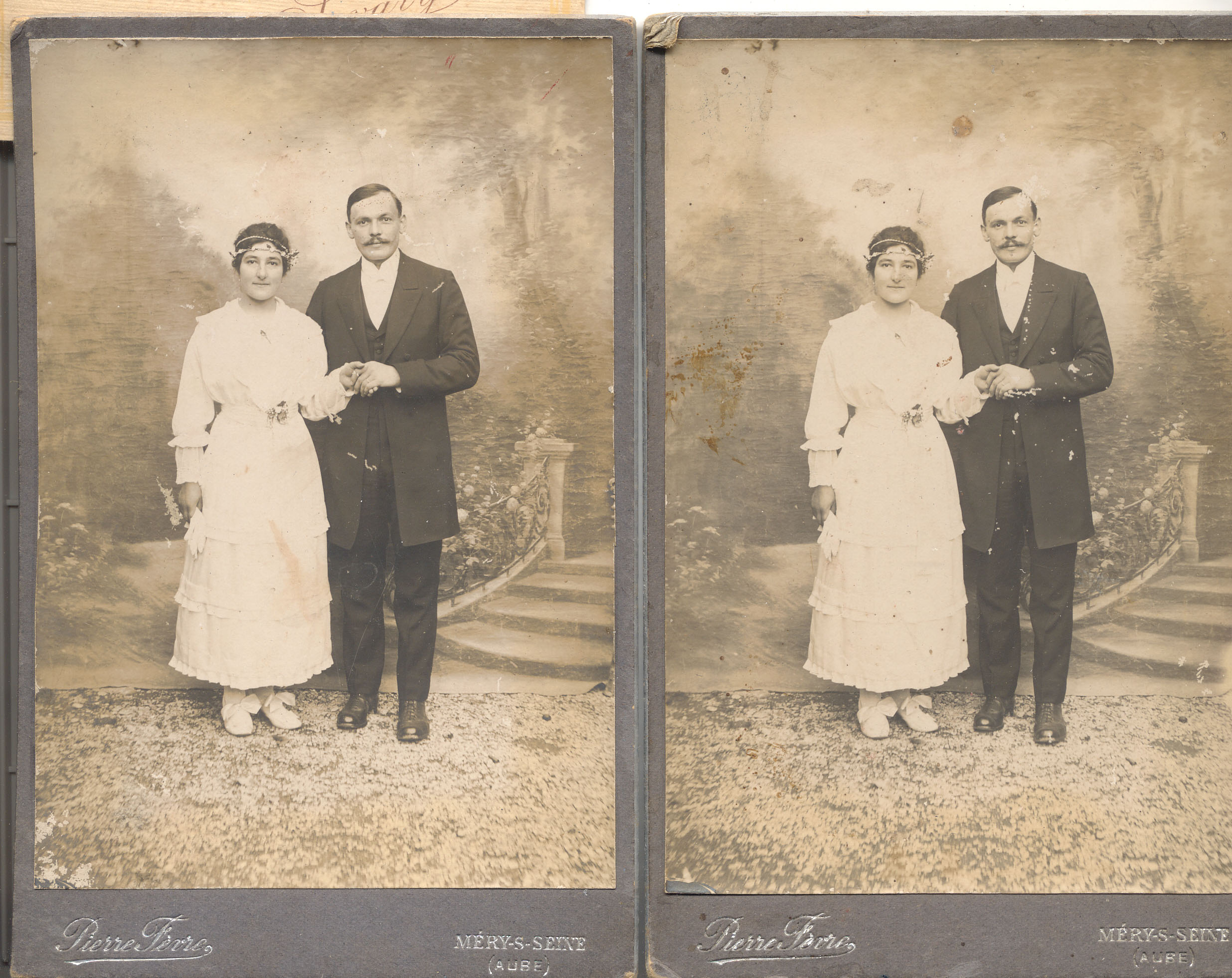 Parmi les photos sans légende de Rose, une seule est en double, celle-ci, prise à Méry sur Seine ( ici avant retouches). Elle est donc importante et pourrait être celle du mariage d'Arthur Lemot et Prospérine Jacquemard. En ce qui concerne le marié, comparons cette photo aux deux autres supposées d'Arthur, prises à Alexandrie. Il y a une ressemblance, mais elle n'est pas évidente. On y trouve tout de même un signe distinctif commun : juste au dessus du milieu de la lèvre supérieure, il y a un coin de peau sans barbe :