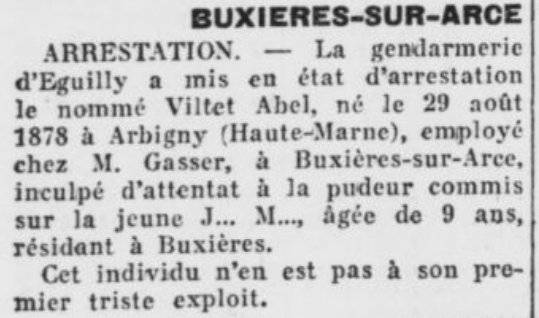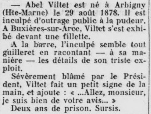 lettre de l'un d'entre eux, qui, en 1910, voyait son "image toute la nuit". Il s'appelait Abel Viltet. Une vingtaine d'années plus tard, Le Petit Troyen le cite à plusieurs reprises dans les faits divers de Buxières sur Arce, pour un attentat à la pudeur les 25, 26, 29 mars 1933 :