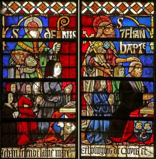 Jean Festuot, ascendant de Noémie, marchand drapier, bourgeois de Troyes, né vers 1440, décédé après 1500,représenté sur un double vitrail de la cathédrale de Troyes avec ses deux fils et, derrière eux, sa femmes Denise Chapelain et ses trois filles, sous le patronage de saint Jean et saint Denis. Légende : "Jehan Festuot l'ainé marchand et bourgeois de Troyes". est |