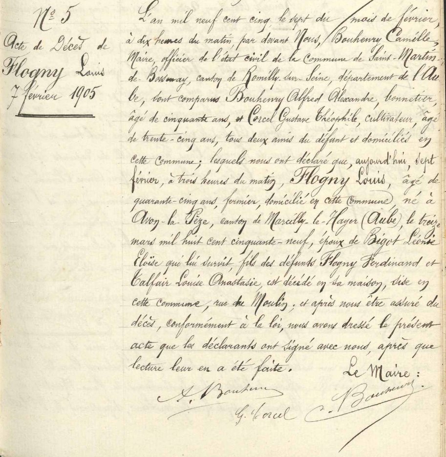 acte) et Léonie Eloïse Bigot, dont aucune trace n'est facilement disponible. Sans doute étaient-ils de passage à St Martin, où aucune famille Flogny ou Bigot ne semble être restée longtemps. L'analyse des tables décennales de Saint Martin de Bossenay montre qu'il aurait eu trois soeurs, Aristide Héloïse Camille Flogny (née vers 1884 à Fay lès Marcilly ?), mariée le 2 mars 1905 avec Louis Adolphe Fourré, Louise Yvonne Trimante née le 26 avril 1887, mariée le 10 juillet 1906 avec Paul Maximin Rigault (d'où une fille Geneviève Rigault, née en 1917 à Nogent sur Seine, mariée avec Yves Paul André Jausseran en 1936 à Cannes), et Hélène Poliscenne née le 22 septembre 1893, mariée en 1912 à St Martin avec Gustave Rozé (lien) dont le petit-fils Gérard Rozé fut maire de St Martin élu en 1995 et 2001 (son père, prénommé Léon comme son oncle, était donc biologiquement un cousin germain de Paul junior) .