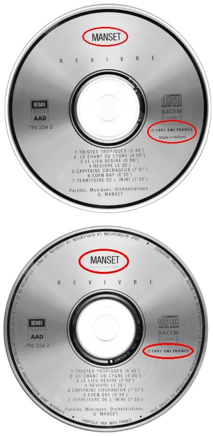 Le CD a fait l'objet de 2 éditions aux mixages différents à quelques mois d'intervalle. Même pochette (rigoureusement) et même référence. Seul le CD lui-même comporte deux petites différences qui permettent de les identifier : le nom MANSET est souligné sur la réédition remixée et l'inscription "Made in Holland" n'y est plus ( ) (quant au livret, il tire davantage sur le rouge...). Sachant qu'il existe aussi une version sans soulignement et sans mention "Made in Holland", hum...